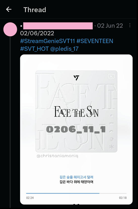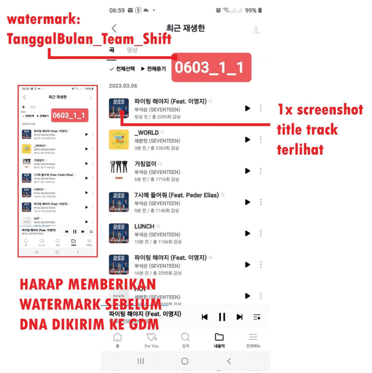 9. Streamer diwajibkan mengupload atau mengirimkan bukti "DNA" di grup masing-masing sebagai bukti bahwa streamers hanya melakukan streaming untuk SEVENTEEN, dan sekaligus untuk mengecek jumlah lagu yang sudah terputar (bertambah).
